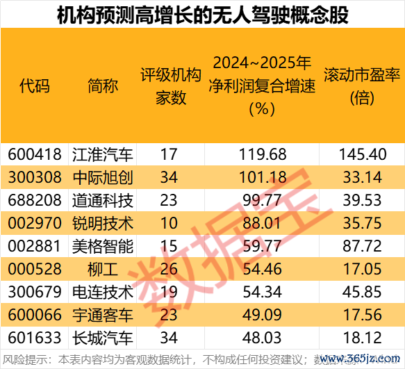 据数据宝统计,2024年前三季度净利润实现增长的无人驾驶概念股中,机构评级家数超10家且一致预测2024~2025年净利润复合增速超40%的个股有9只。